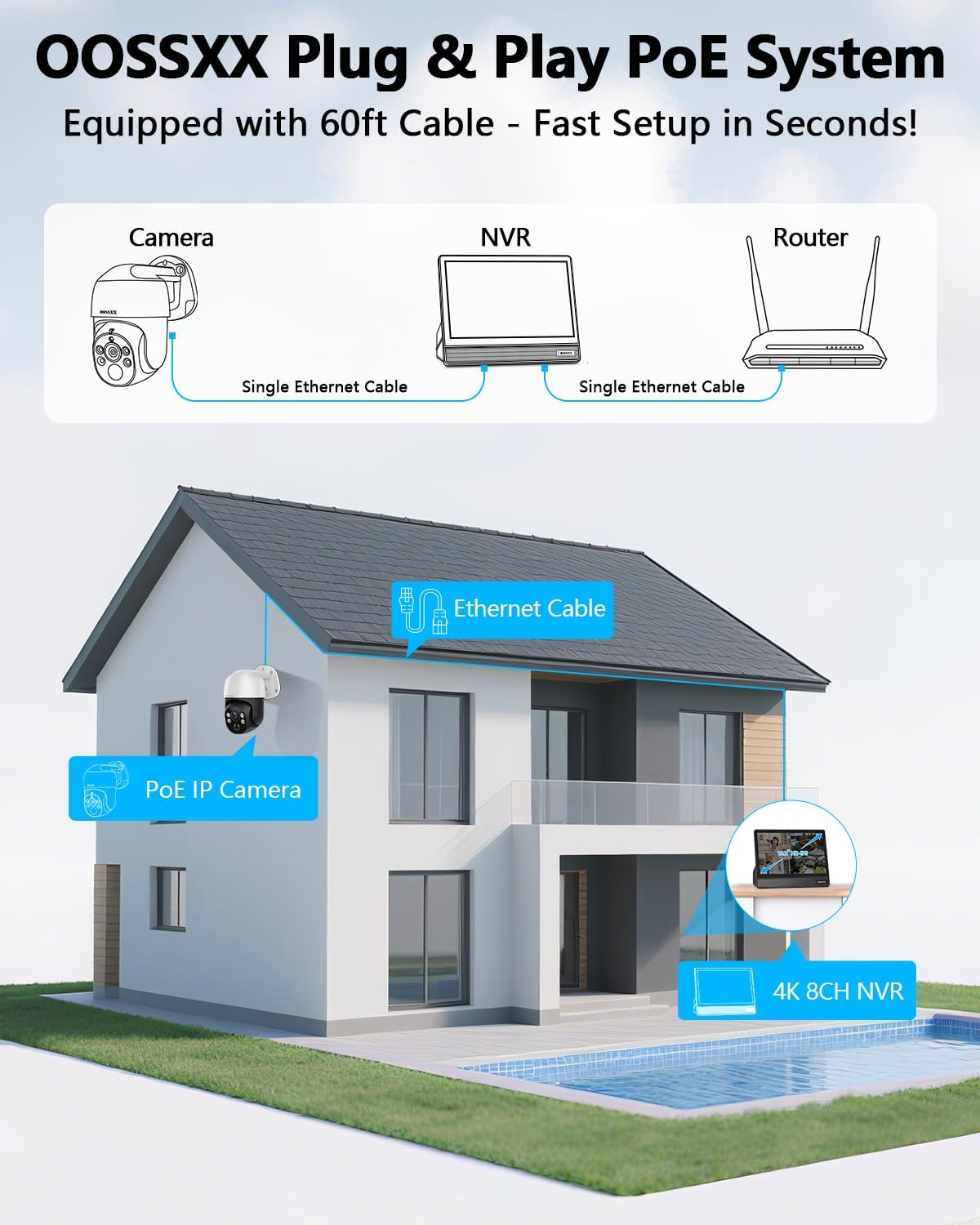 Video abspielen OOSSXX (4K/8,0 Megapixel und PTZ-Digitalzoom) 2-Wege-Audio-PoE-Sicherheitskamerasystem für den Außenbereich Kabelgebundenes IP-Videoüberwachungssystem für den Außenbereich