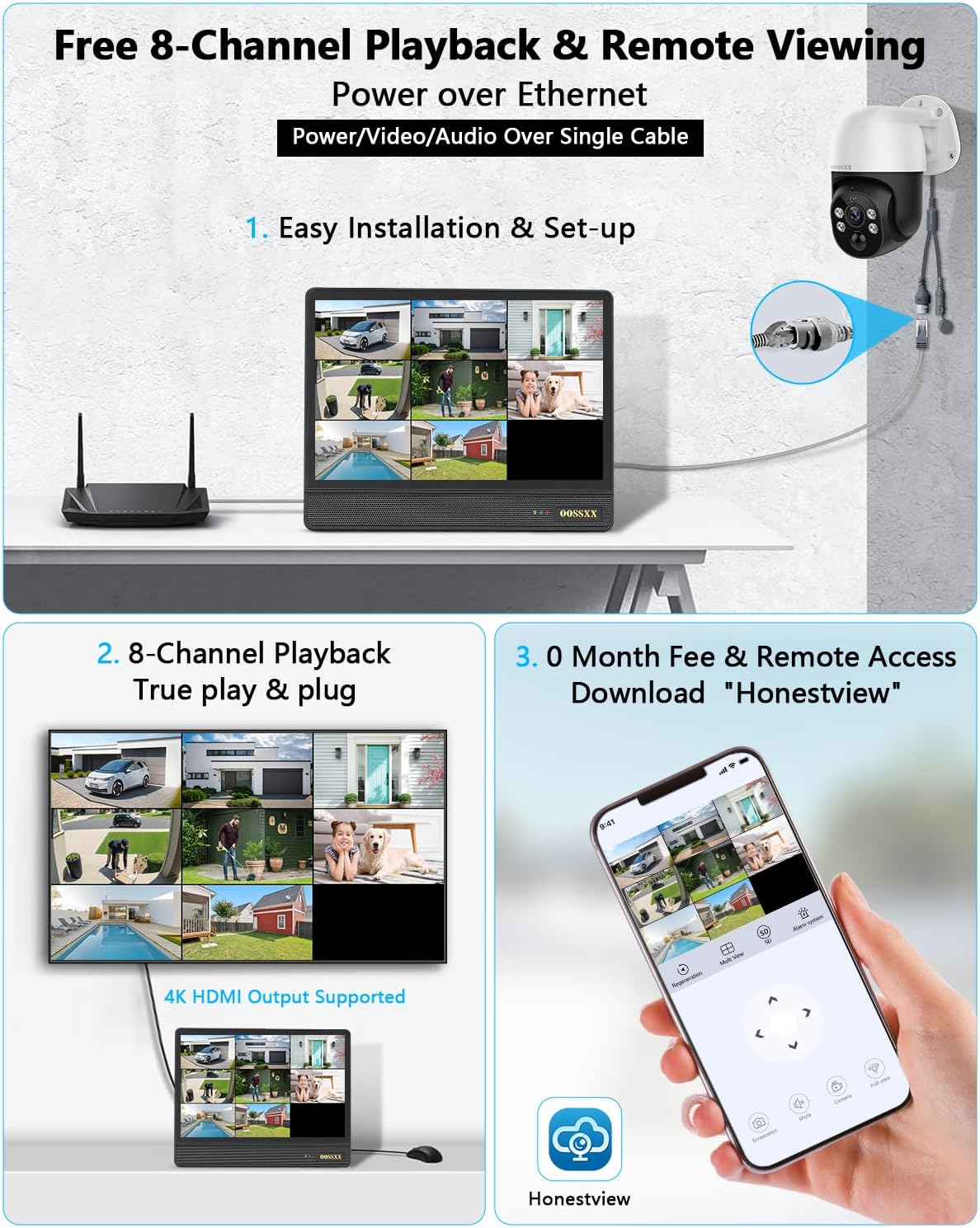 Die OOSSXX 4K Ultra HD (8 MP, 3840 × 2160) PoE-Kamera bietet fast die vierfache Klarheit von 1080p. Unser Kamera-Kit bietet Benutzern eine lebendige Anzeige, selbst wenn Sie digital hineinzoomen.
