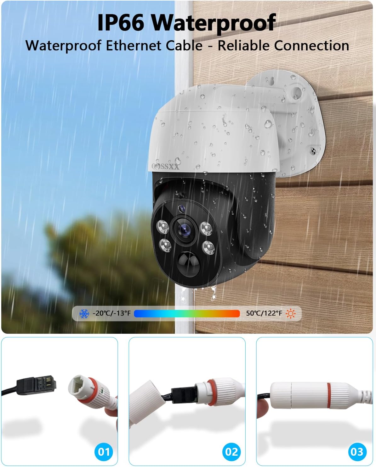 Video abspielen OOSSXX (4K/8,0 Megapixel und PTZ-Digitalzoom) 2-Wege-Audio-PoE-Sicherheitskamerasystem für den Außenbereich Kabelgebundenes IP-Videoüberwachungssystem für den Außenbereich
