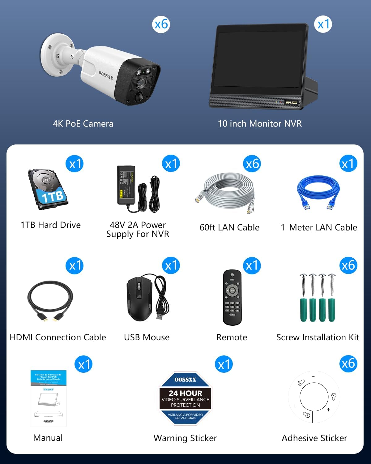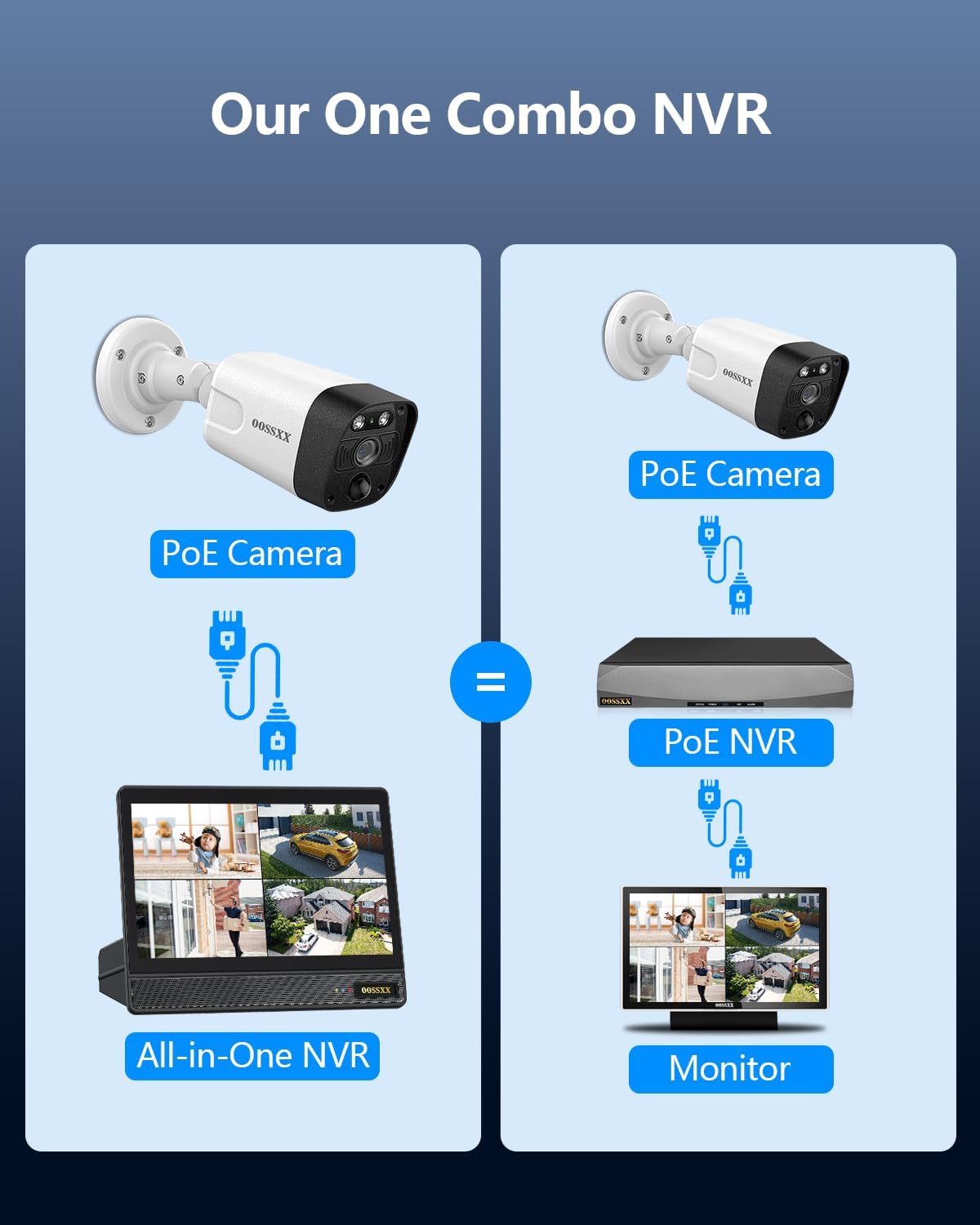 - {Plug and Play PoE System} The camera kit comes with 60ft network cables, which allows for easy installation and set-up. After connecting the security cameras to the NVR ports, recording and live views can be seen within seconds via an HDMI monitor.