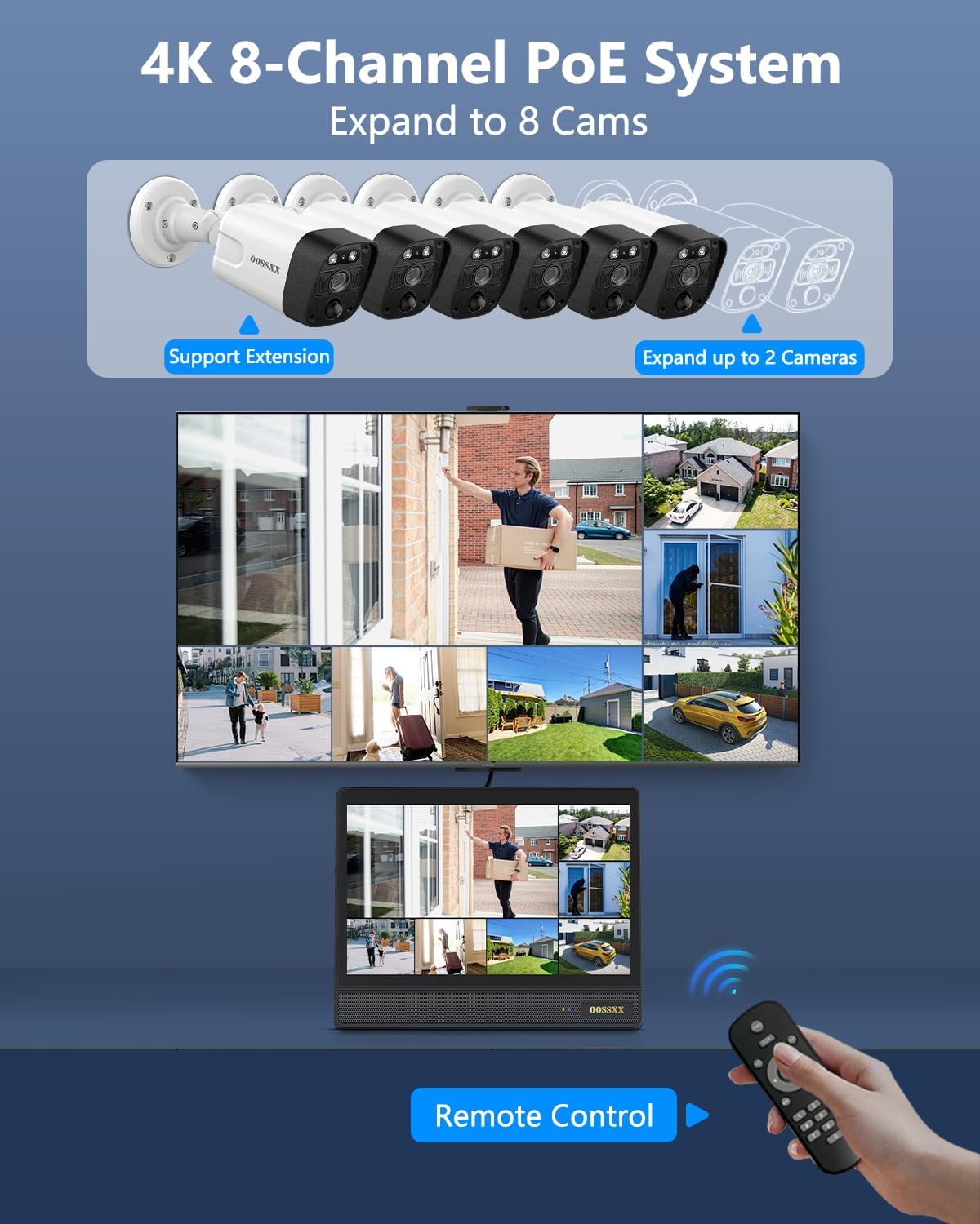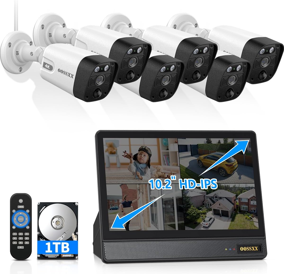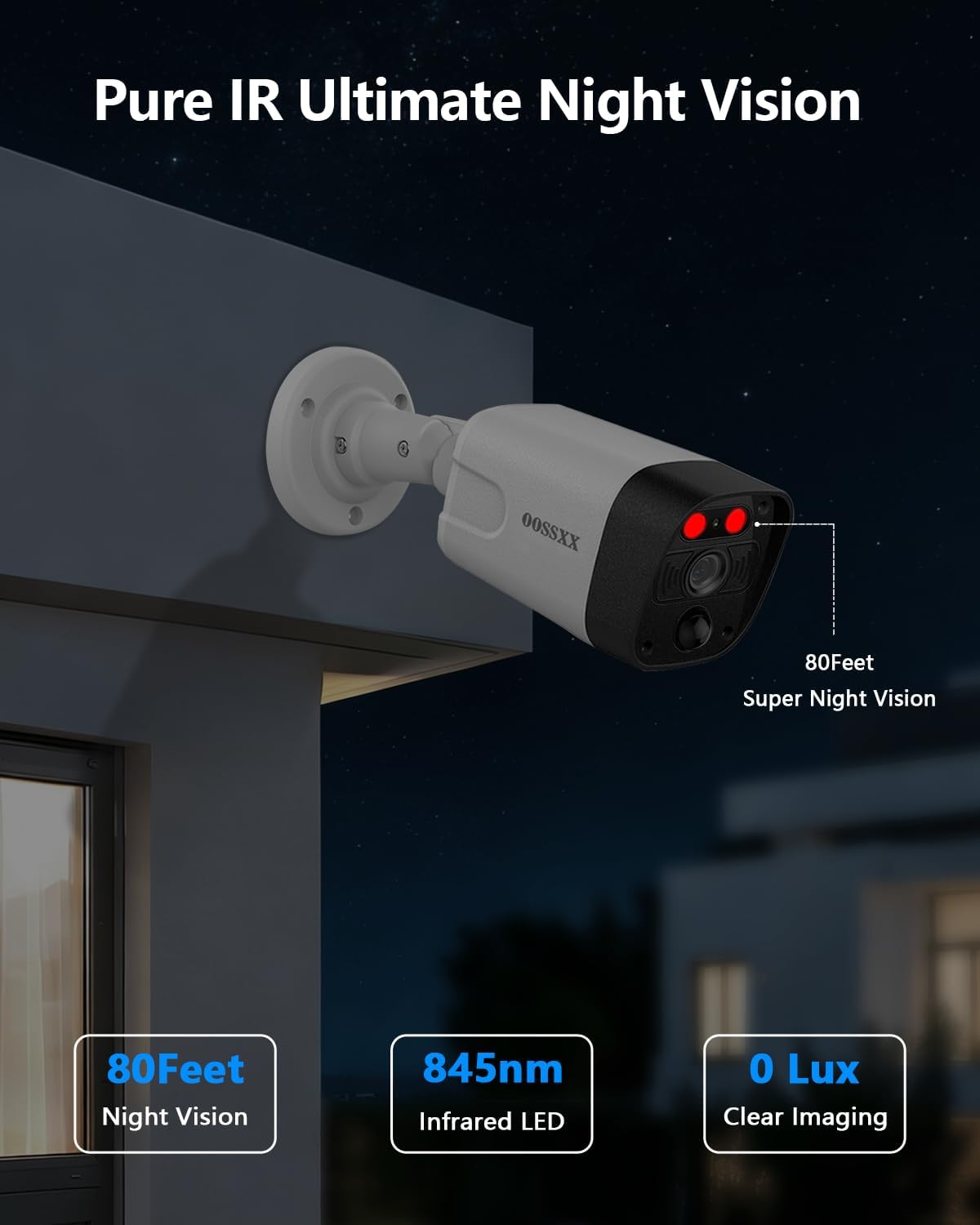 - {4K Ultra HD} OOSSXX 4K Ultra HD (8MP, 3840 × 2160) 4K security camera delivers almost four times the clarity of 1080p. Our surveillance cameras for home security provides users a vivid display, even when you digitally zoom in. 80 feet IR-LED night vision camera automatically activates infrared mode in dark areas.