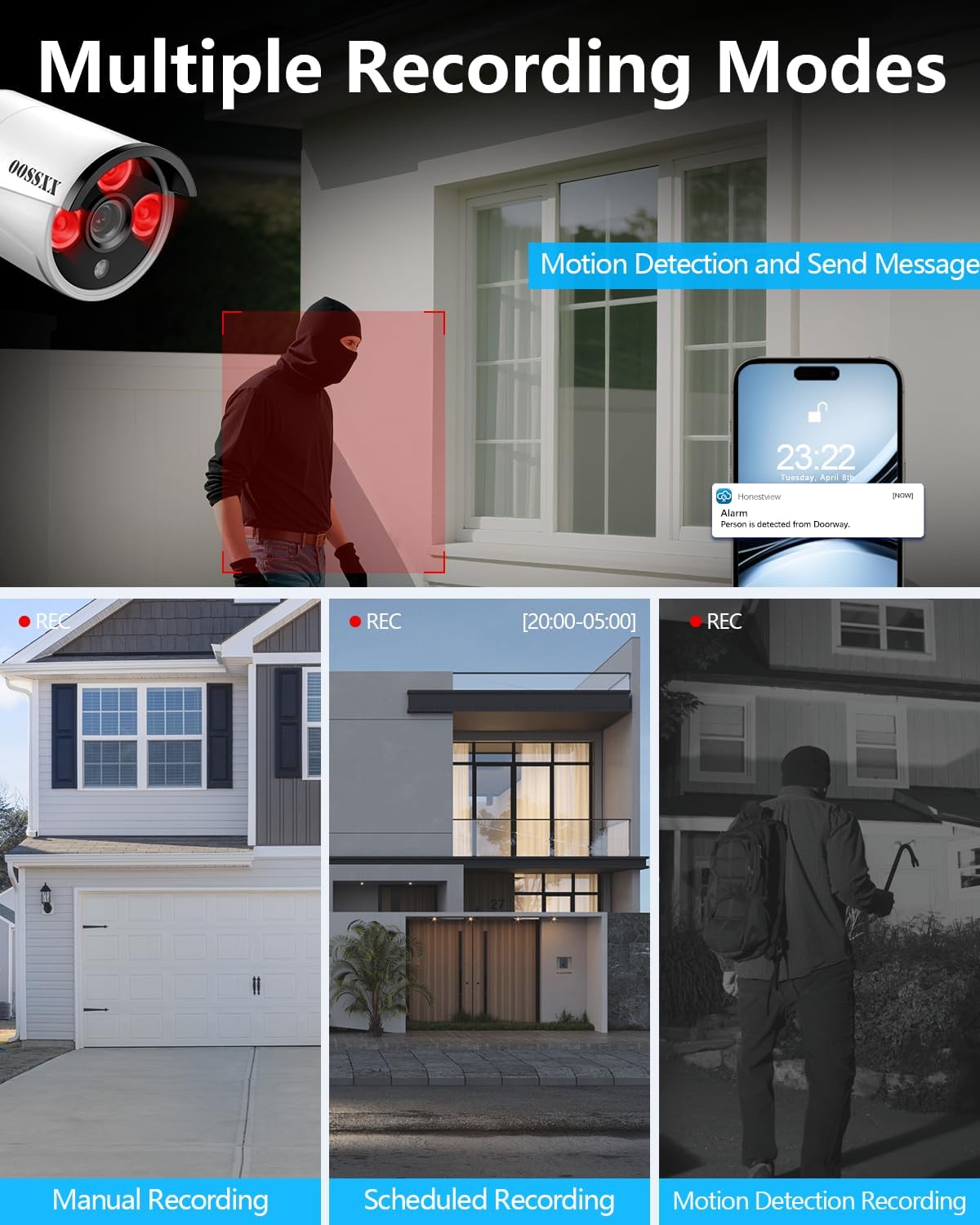 • {Free APP No Month Fee} Download the free app "Honestview" from App Store on your smartphone. With an internet connection, you can watch the videos remotely from anywhere on your phone (IOS&Android), PCs, or tablet.