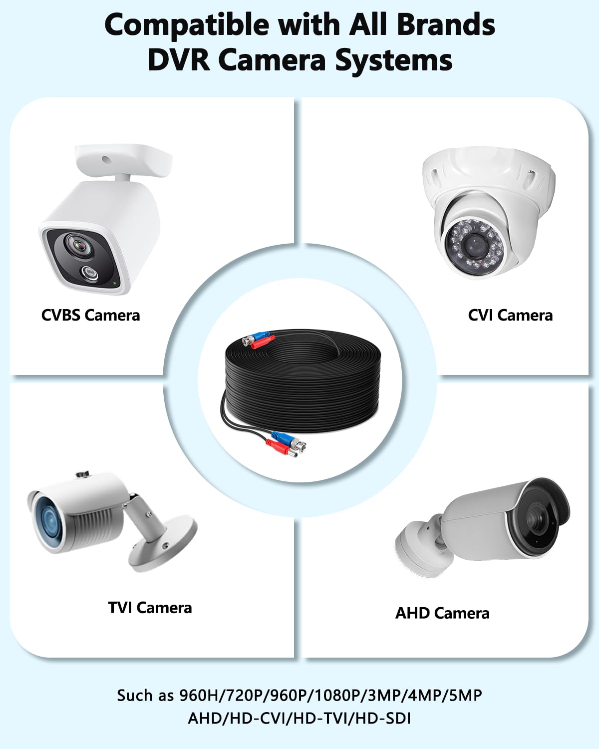 - {Wide Compatibility} The BNC cable is compatible with all brand surveillance dvr camera and cctv camera security system, including 960H/720P/960P/1080P/3MP/4MP/5MP resolutions, as well as AHD, CVI, and TVI formats.
