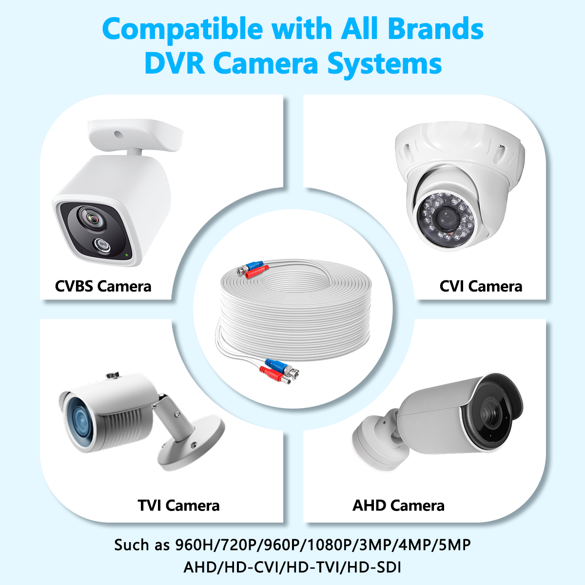 - {Wide Compatibility} The BNC cable is compatible with all brand surveillance dvr camera and cctv camera security system, including 960H/720P/960P/1080P/3MP/4MP/5MP resolutions, as well as AHD, CVI, and TVI formats.