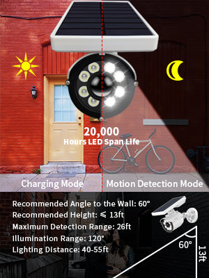 - {WORKING MODE} The Solar Home Safety Light has a motion detection function with built-in PIR sensors that can detect up to 20-26 feet and angle of 120°. When motion is detected, turn on the highlight (800LM) for 20 seconds, with a illumination range of 40-55 feet and 2300 square feet. Subsequently, the highlight is automatically converted to infrared lighting.