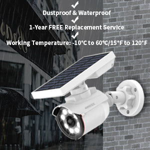- {IP66 WATERPROOF & RUSTPROOF} Grade IP66, it can handle all the bad weather. Recommended working temperature -10℃ ~ 60℃ (15 ~ 120℉). High-strength ABS plastic housing ensures dummy CCTV solar light work perfectly in different weather conditions. Ideal for Yard, Garage, Patio, Porch, Garden, hway, Fence, Front Post Door, Deck, Backyard, Driveway.